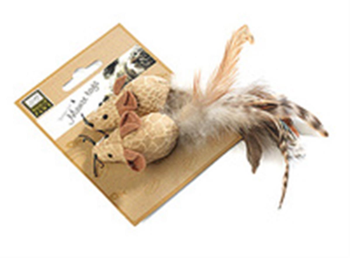 2 petits souris faites à la main et remplies avec l'herbe aux chats pour les inciter à jouer pendants des heures.